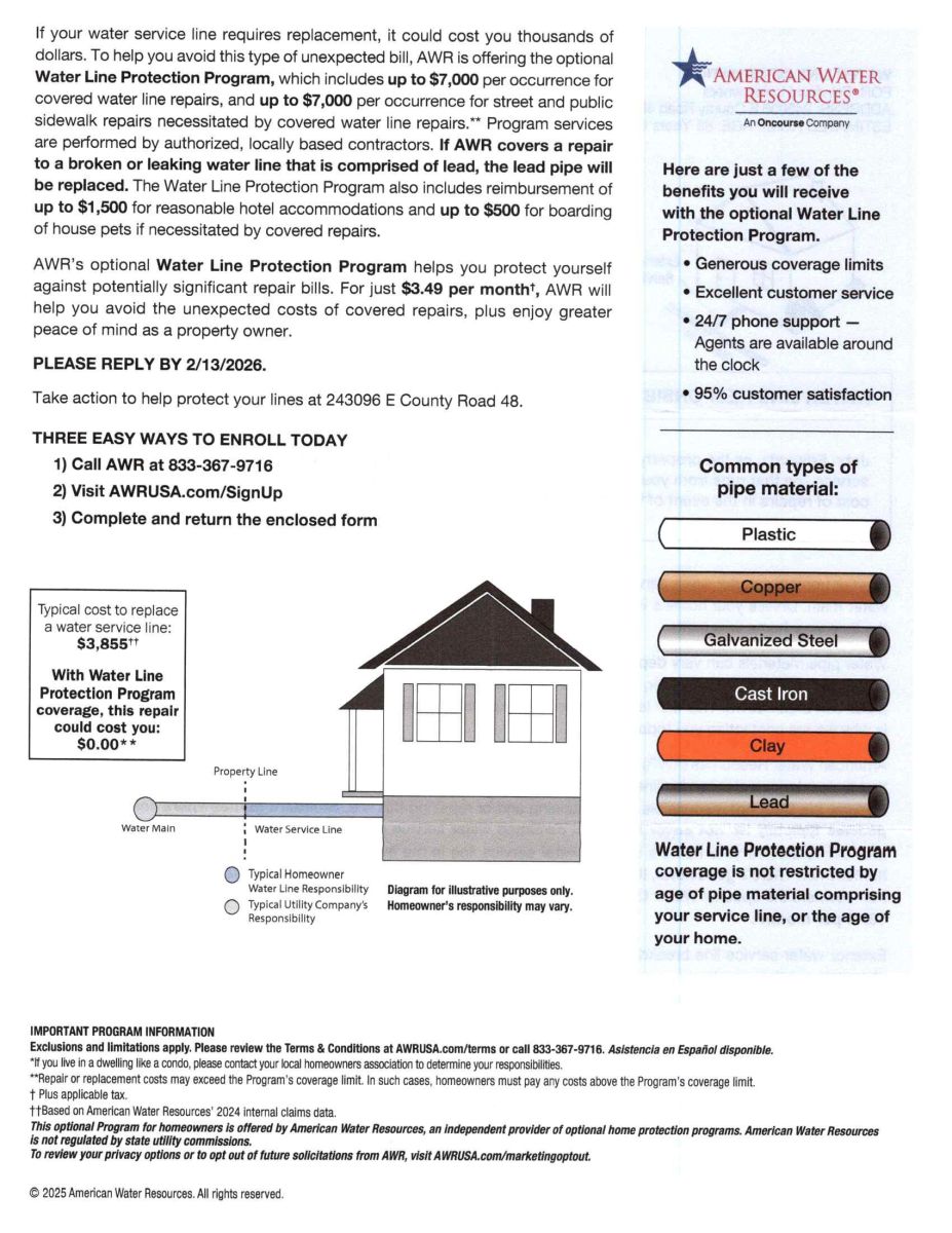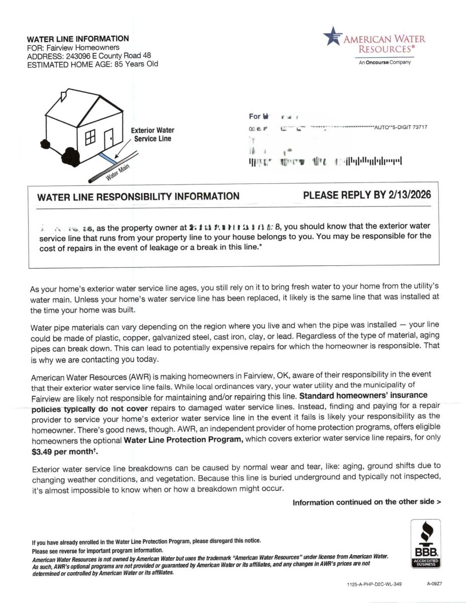 It was brought to my attention by a few customers that a letter has been sent out on behalf of Water in regards to service lines. After seeing a copy of that letter, I can confirm that was NOT sent by Major County Rural Water District #1. Please do more research with me to make sure it is not a Spam Risk. I am putting out this announcement just to let everyone know that I will be doing my homework on it as well to make sure our customers are not scammed in any way, or if it is an honest letter.